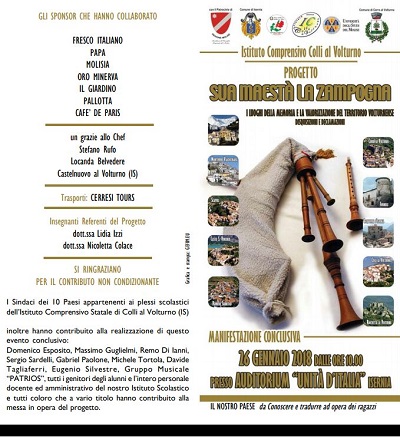 La conclusione del secondo atto “Sua maestà la zampogna” si avvicina … con il patrocinio della Presidenza del Consiglio Regionale grazie al Presidente Vincenzo Cotugno, dell’USR, grazie ad Anna Paola Sabatini, dell’UNIMOL, del Lions Club , del Rotary Club,della città di Benevento, e soprattutto dei dieci comuni del nostro Istituto: tutti hanno dovuto impiegare grandi energie, dalla Dirigente dalle docenti referenti a tutto il personale scolastico e amministrativo, agli amministratori e ovviamente agli alunni e ai genitori sempre pienamente collaborativi.